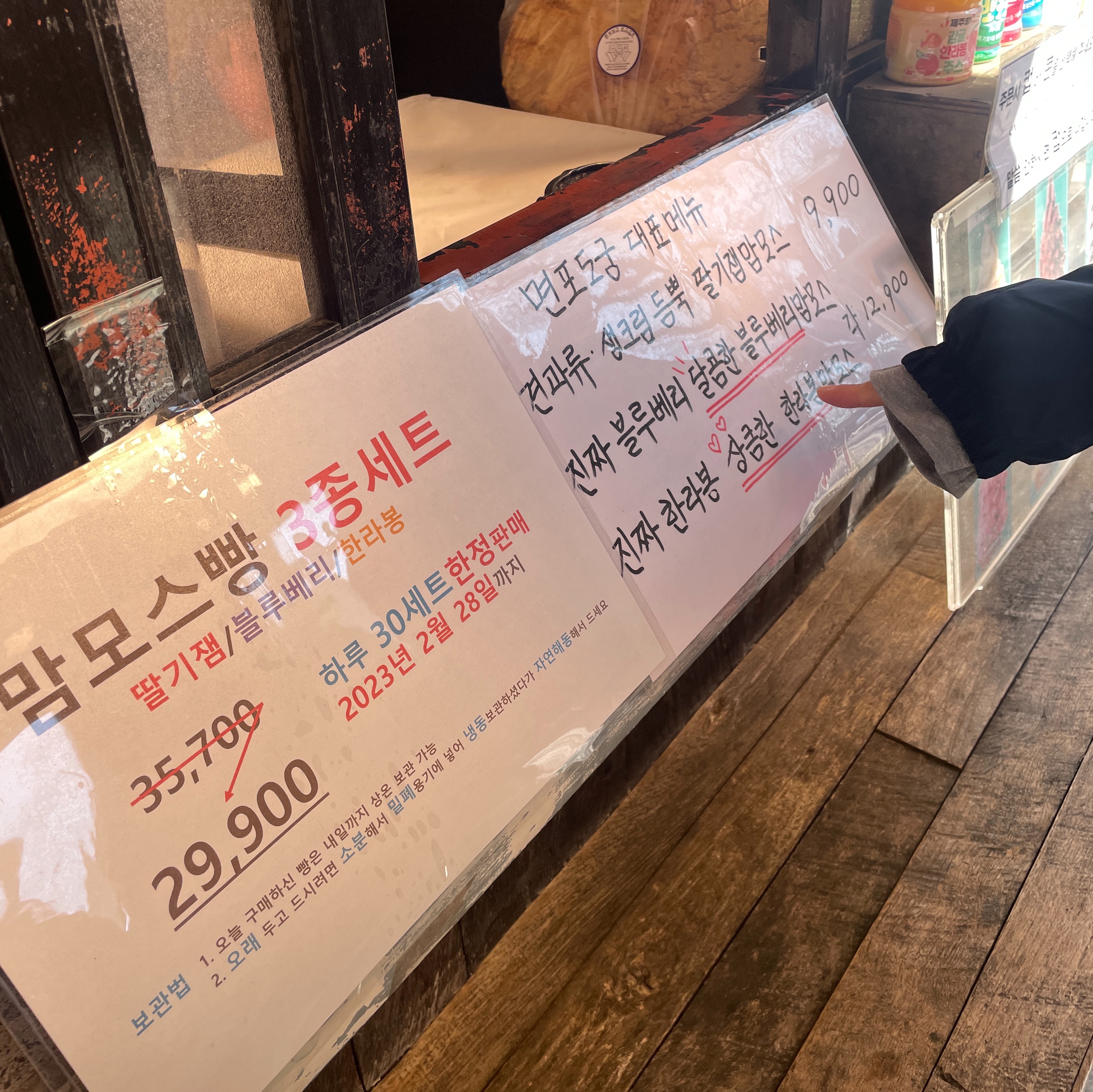 맘모스빵은 딸기잼, 블루베리, 한라봉 세 가지 맛이 있고, 3종 세트는 하루 30세트 한정 판매하네요.