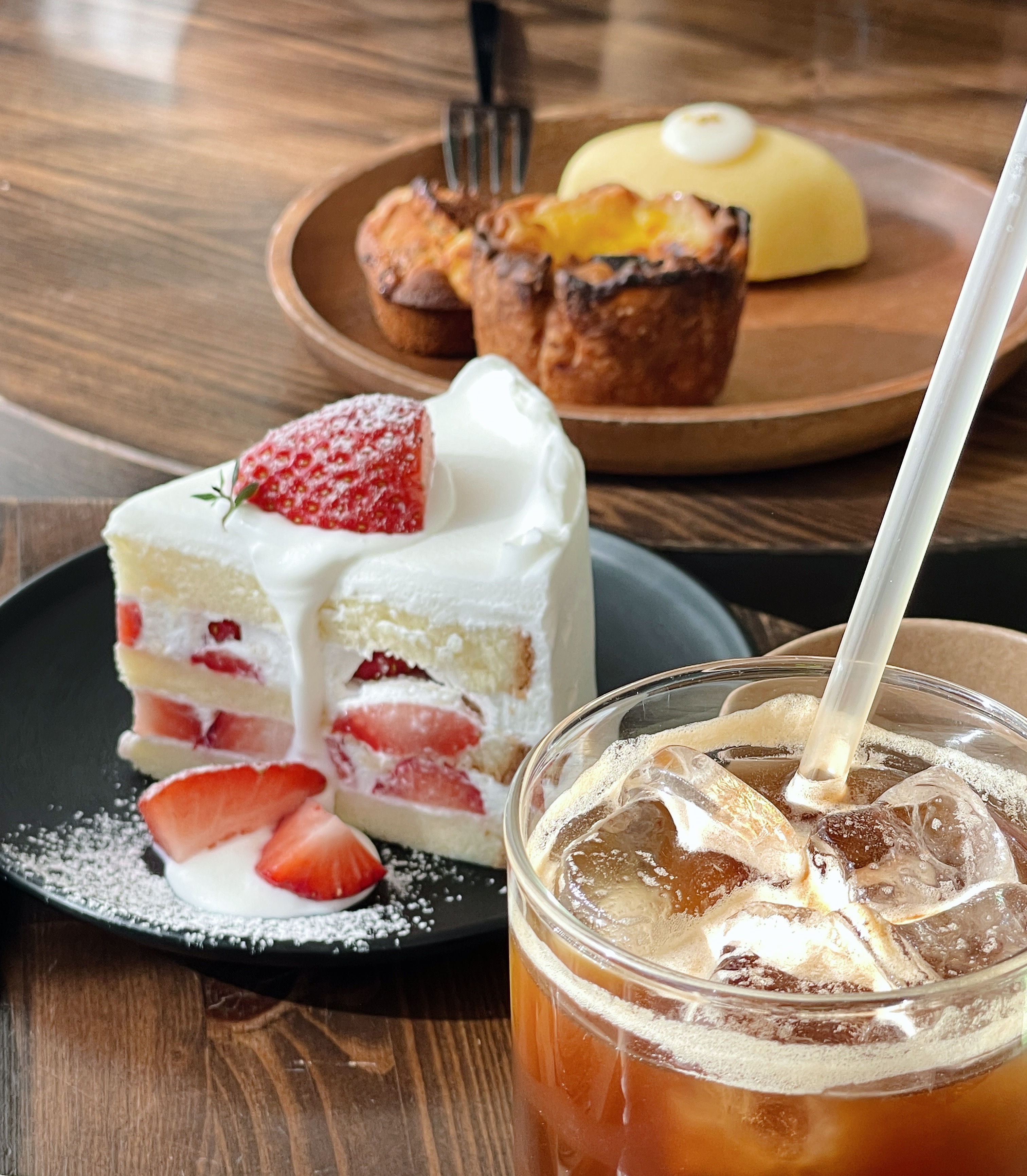 운동하고 왔으니 시원하게 아이스아메리카노 때려주고요. 딸기케이크랑 에그타르트 맛있었어요.