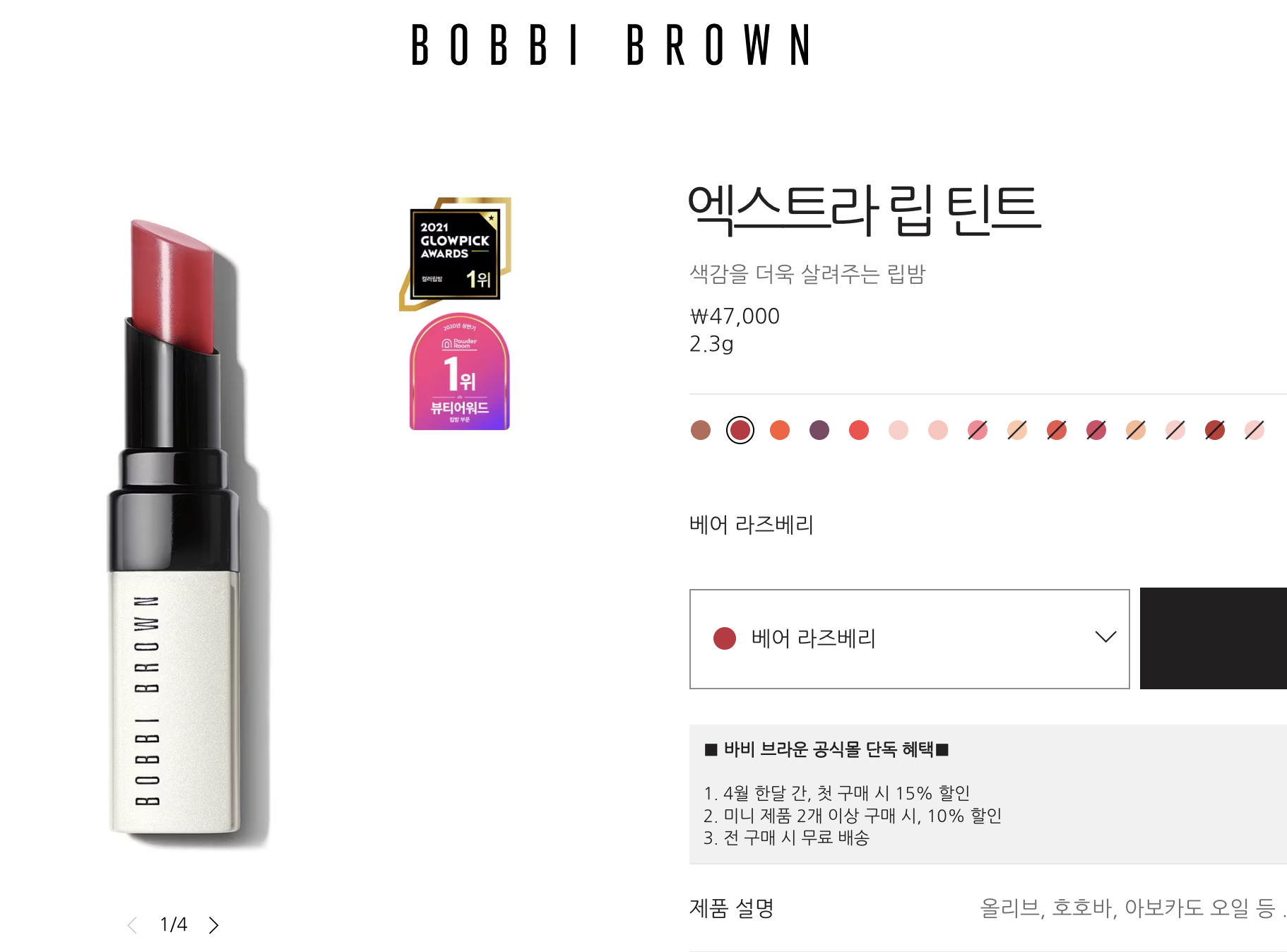 저는 바비브라운 엑스트라 립틴트 4개를 구매했어요.