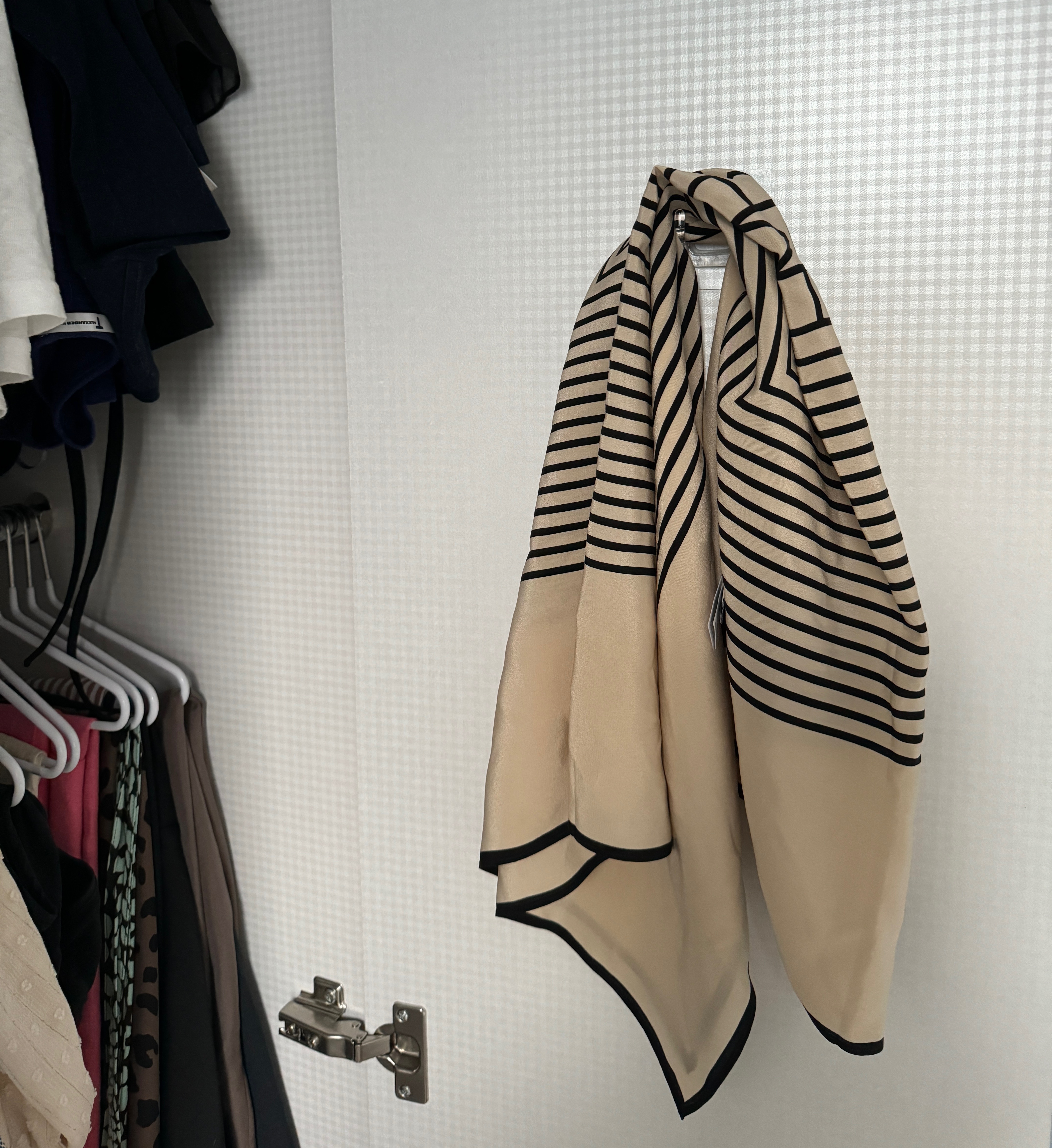 옷장 문 공간은 노는 공간이라, 여기에 벨트나 스카프들 두 가지 후크 종류별로 걸어둡니다.
