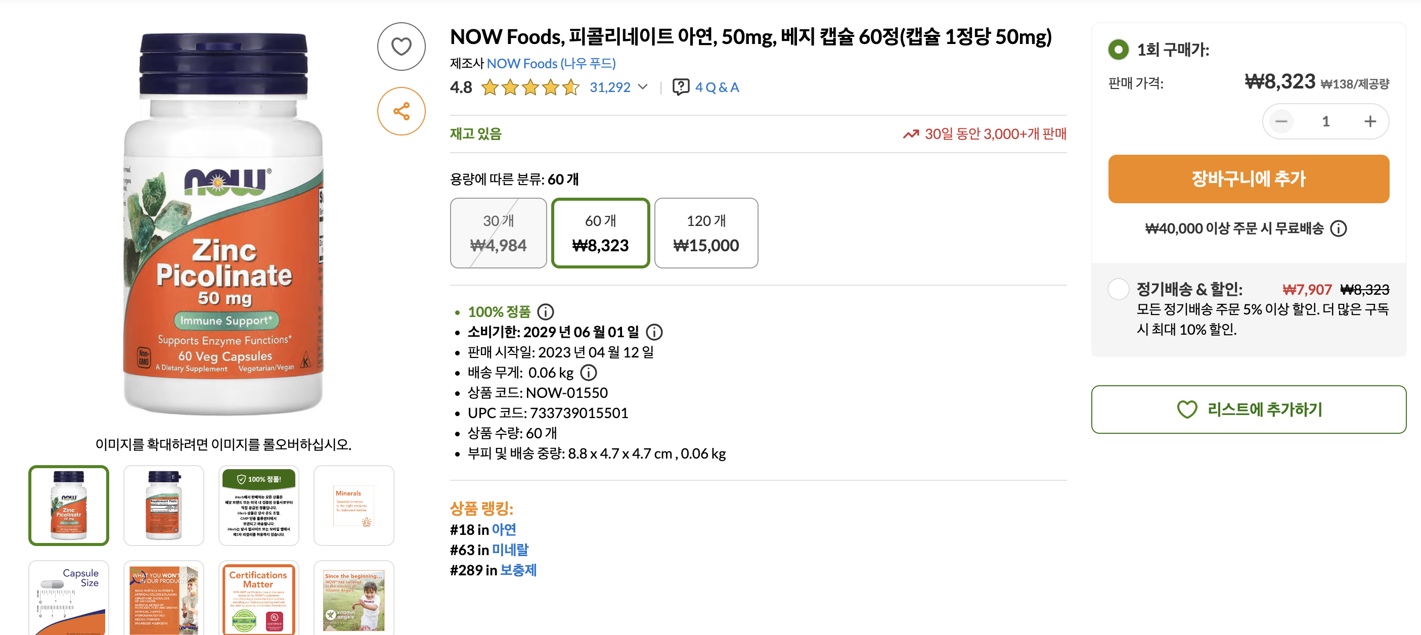 Now Foods 피콜리네이트 아연 50mg