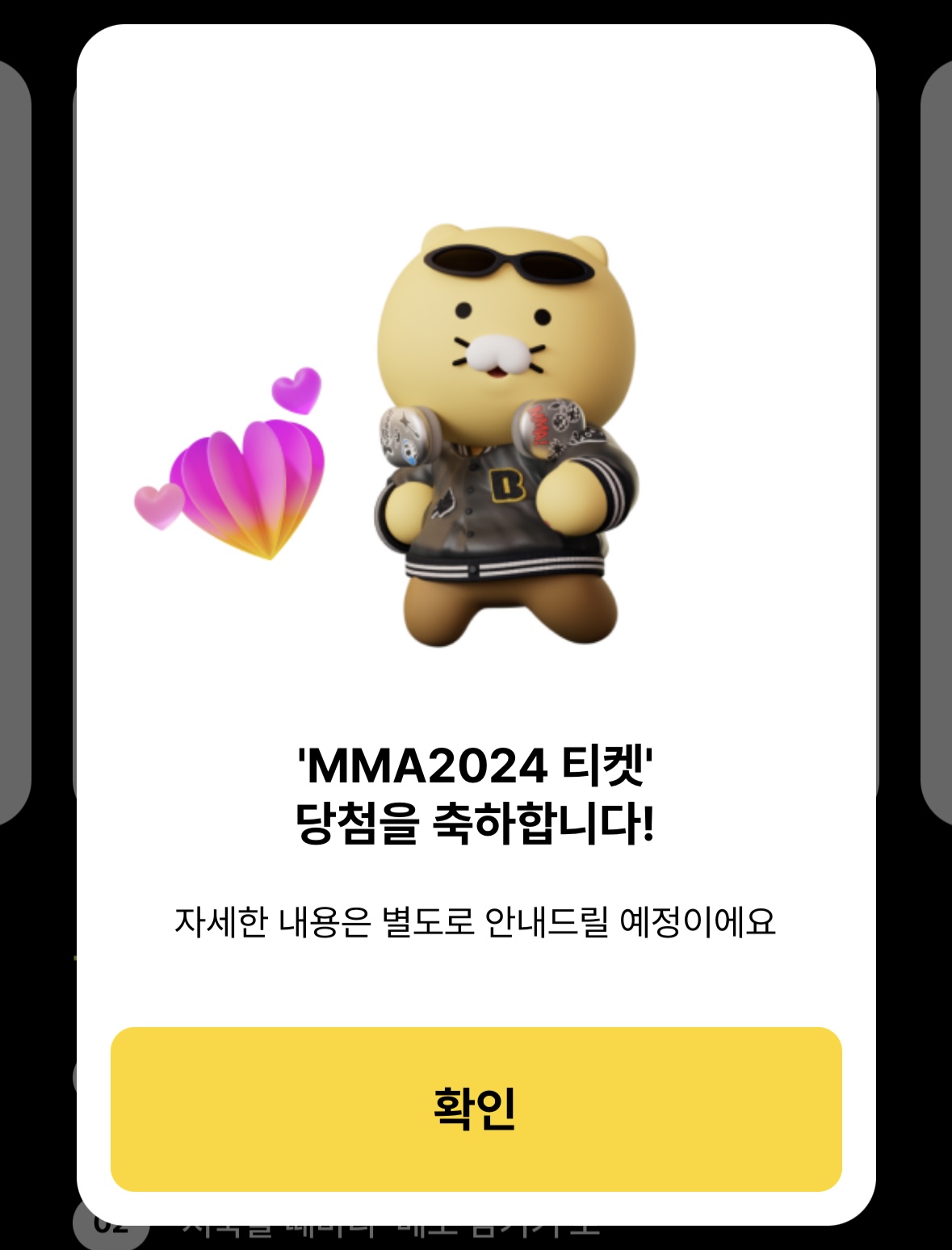 2주차 당첨자 확인을 해보니 'MMA 2024 티켓' 당첨을 축하합니다!