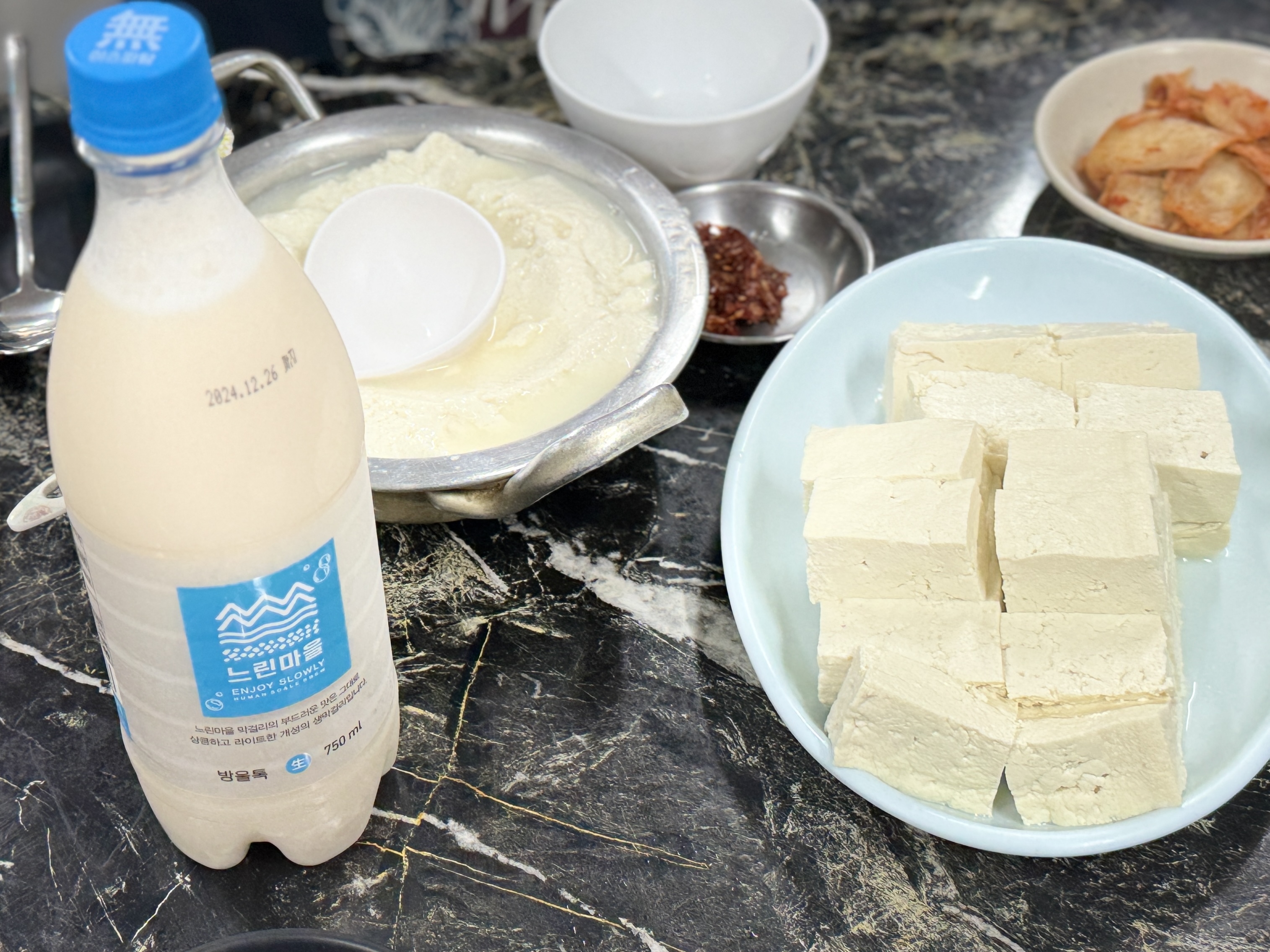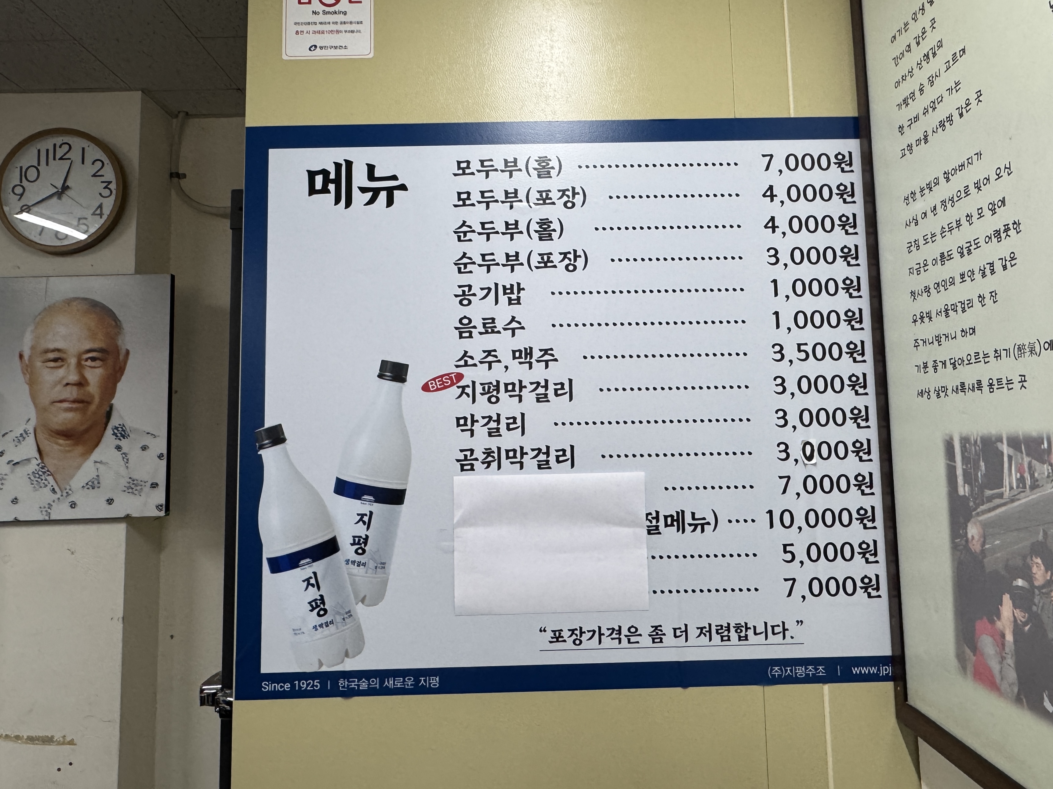 모두부 7천원, 순두부 4천원, 막걸리 하나 3천원.