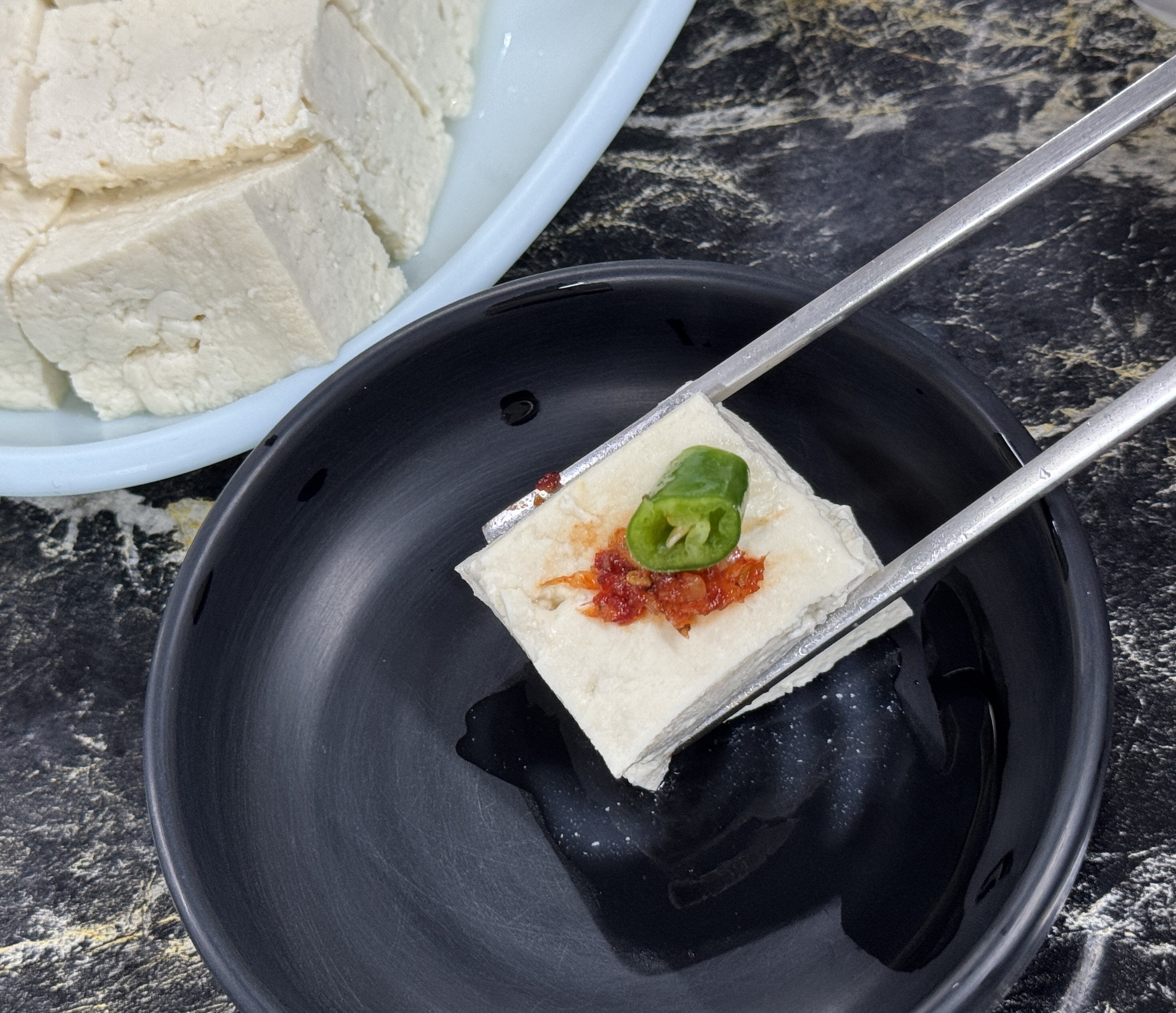 모두부에 새우젓갈 + 고추 조합.