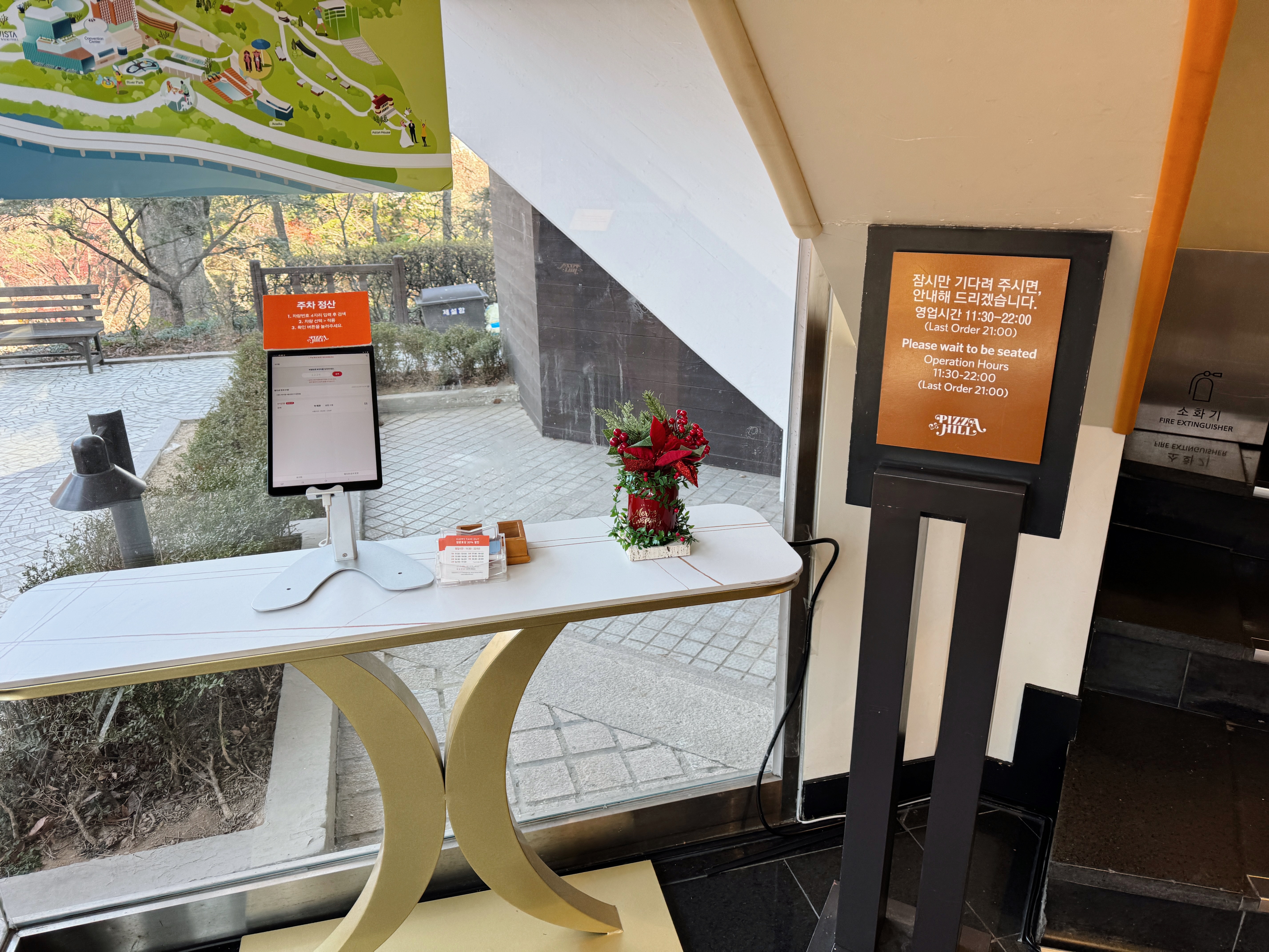 주차는 계산대 입구의 패드에서 주차정산 등록하면 되고요, 6시간 무료입니다.