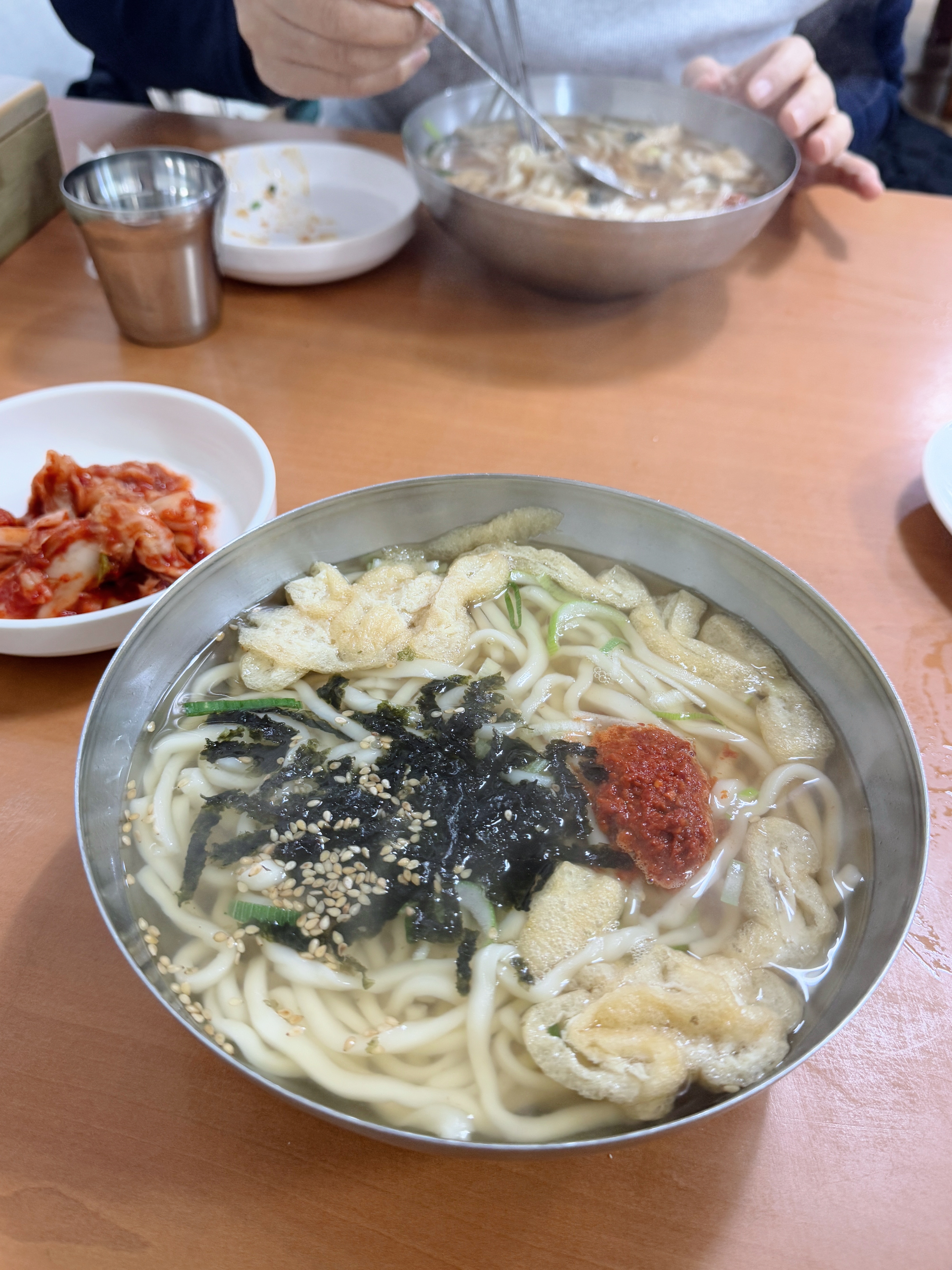 멸치 육수 베이스에 김가루와 유부가 올라간 칼국수인데, 면은 적당히 쫄깃하고 국물은 깔끔한 편이에요.
