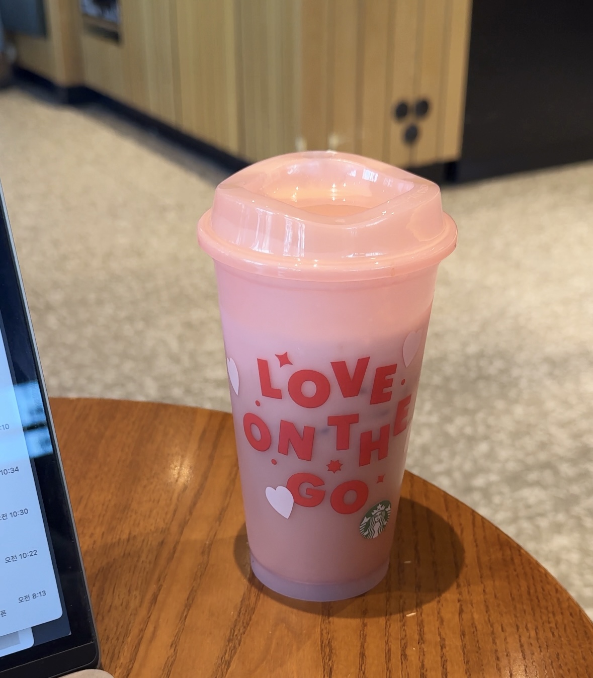 연한 핑크 컬러에 LOVE ON THE GO 라고 써있어요. 스타벅스 로고는 작게 들어가있어서 좋았고요 ㅎㅎ