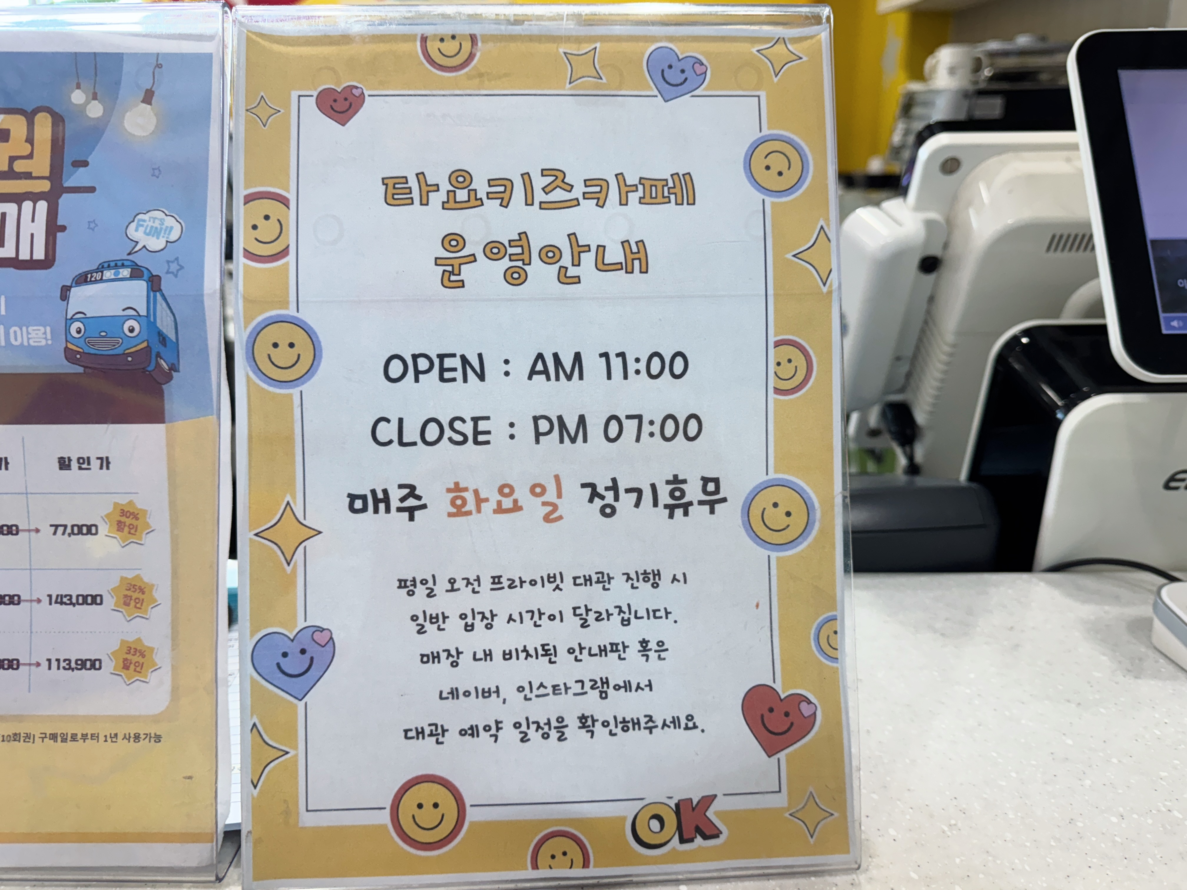 - 타요 카존 이용 시간 체크: 타요 전기차는 매 정각에 운행하니 시간을 미리 체크해두세요.