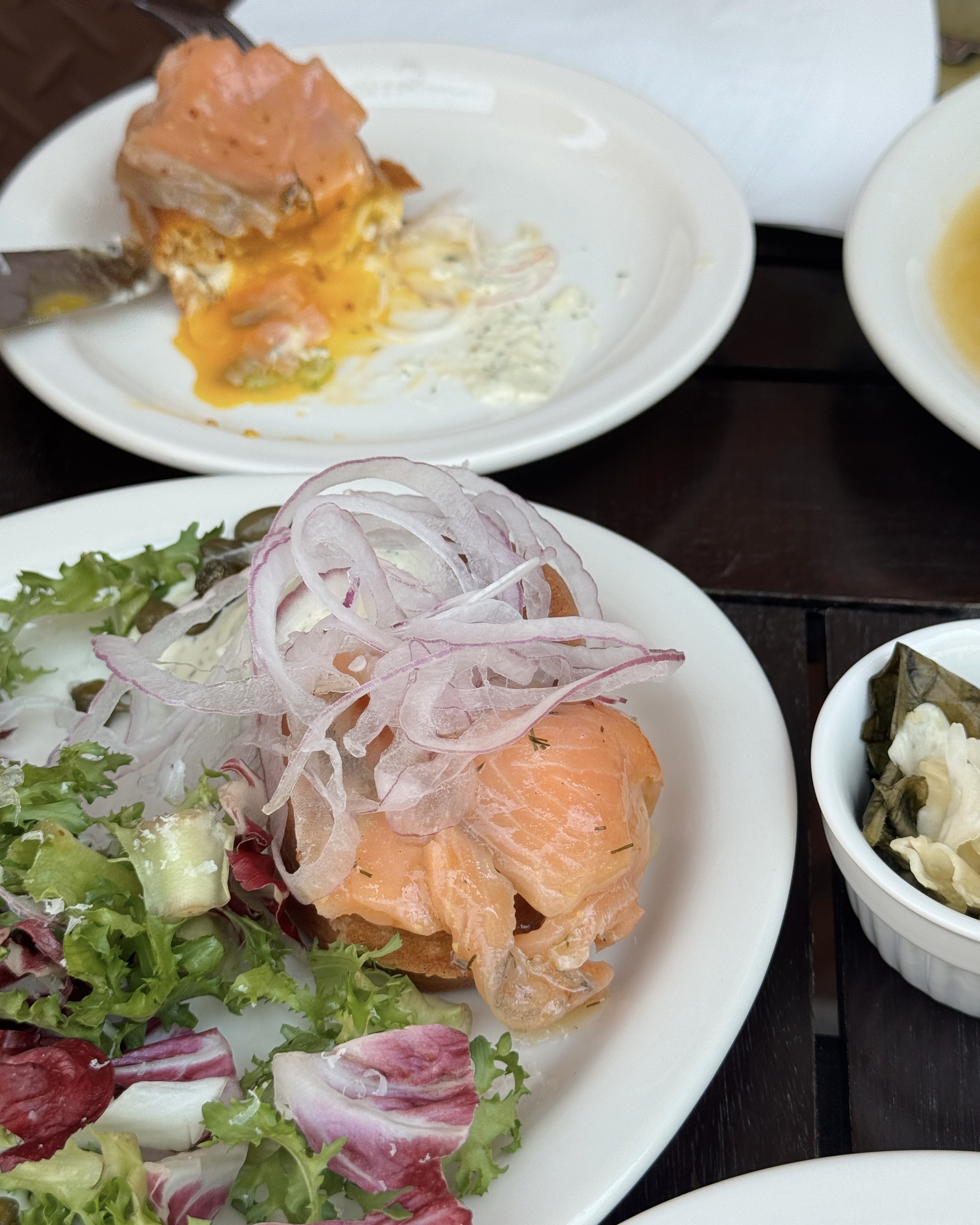 바삭한 계란빵에 연어랑 적양파 올라가있어요.